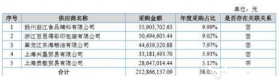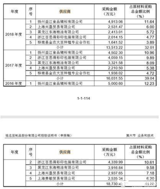 据招股书显示,2016年祖名股份对当年前五大供应商的采购额分别为5,000.60万元、4,339.99万元、3,916.84万元、2,937.65万元和2,535.34万元,而同期年报数据则显示的是5590万元、5049万元、4464万元、3318万元、2865万元,明显年报当中的数据高于招股书中的数据。