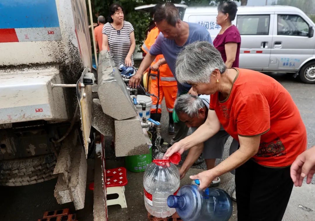 2023年8月2日,北京市门头沟区妙峰山镇陈家庄村,村民从应急供水车取水。当日,北京门头沟区水务局调派应急供水车给抢通道路的陈家庄村运水。中新社记者 易海菲 摄