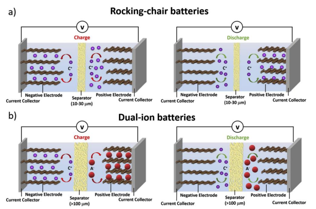 双离子电池的概念是由双炭电池(DCBs)或双石墨电池(DGBs)发展而来的,源于对石墨层间化合物(GICs)的研究。