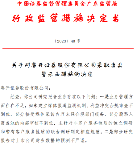 决定书显示,粤开证券的研究报告业务存在业务管理方面存在不足,如未建立媒体报道监测机制、利益冲突合规审查不到位、部分接受媒体采访内容未经合规部门报备、部分股票入覆盖池的内部审核不到位,未针对非客户服务性质的独立调研和带有客户服务性质的联合调研制定相应规范;部分研究报告对上市公司财务数据的预测不严谨的问题。