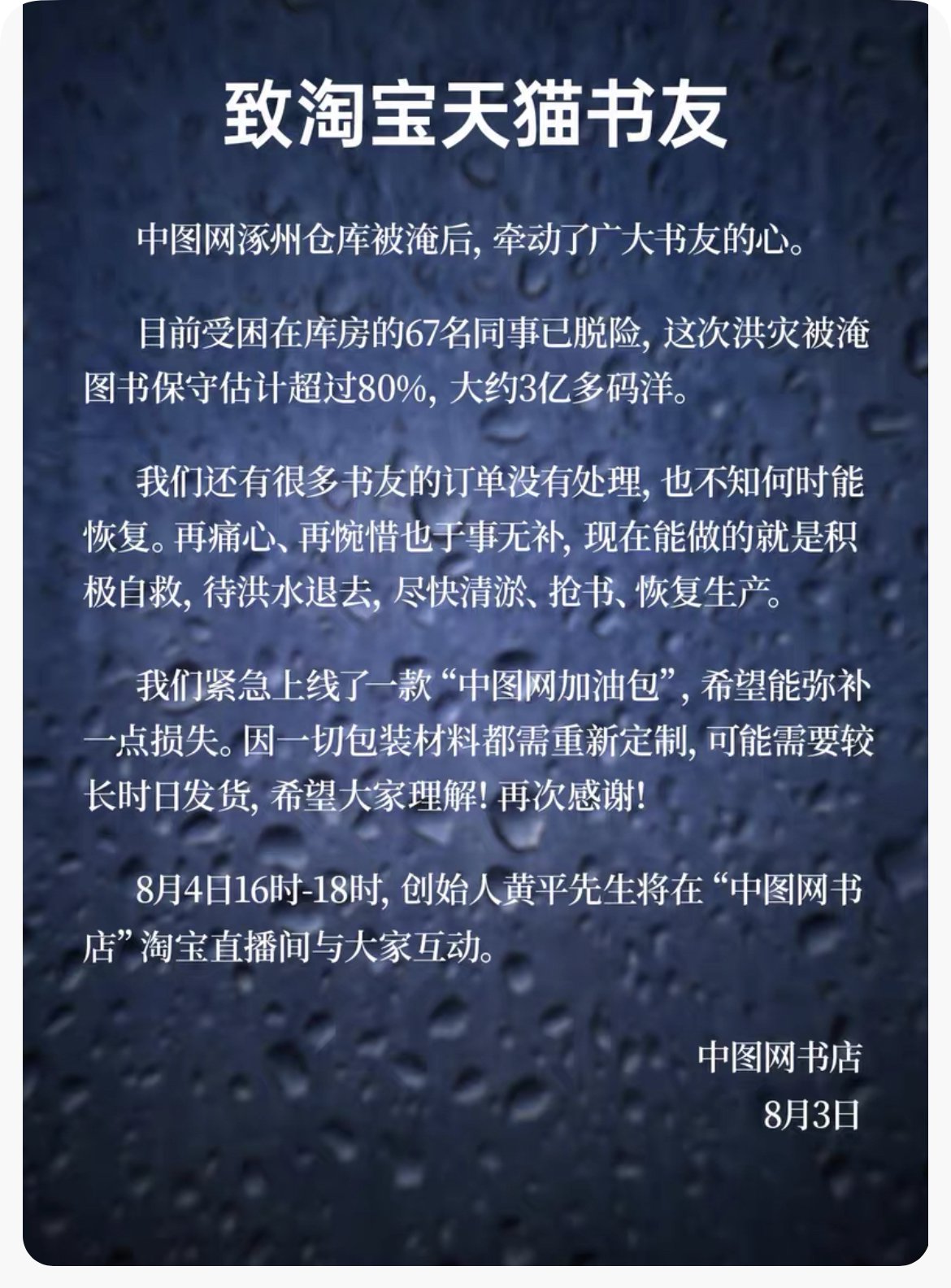 中图网在过去几天里受到了大量关注,众多受涿州水灾影响的图书企业中,中图网几乎是受灾最严重的那一个,黄平预计,有400多万册图书“打水漂”,损失超3亿码洋(全部图书定价总额)。