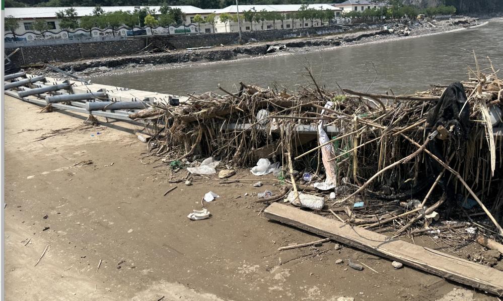 受灾现场的大部分泥土因为高温天气已经凝固,救援车辆陆续经过扬起阵阵灰尘。但仍有地势较低处的积水和淤泥等待清理。