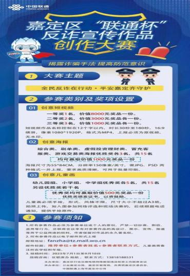 上海联通携手嘉定区反诈联席会议办公室共同举办嘉定区“联通杯”反诈宣传作品创作大赛,面向全社会征集反诈创意短视频、创意海报、创意儿童画。通过本次活动,营造了全民反诈的良好氛围,也为反诈宣传征集到了不少“金点子”和优秀作品。