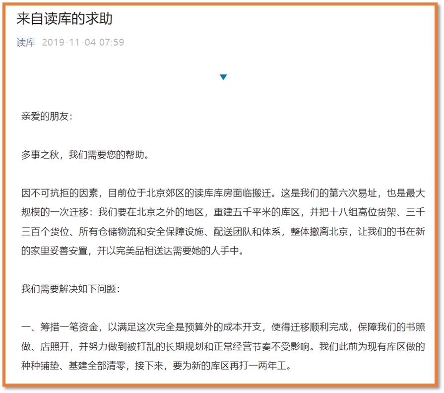 2019年的冬天,“因不可抗力的因素”,读库将库房从北京搬到了南通。当年的11月4日,读库一篇发在公众号上的“来自读库的求助”文章,成了当年的10万+。