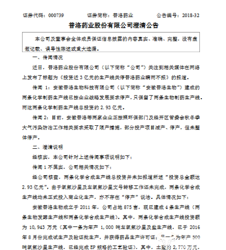 2018年12月4日,普洛药业发布澄清公告,称安徽普洛生物两条生物发酵生产线投资额为22019万元,由于氧氟沙星及左氧氟沙星文号转移工作还未完成,两条化学合成生产线均未正式投入商业化生产,亦不存在“停产”说法,同时安徽普洛生物暂未收到相关部门通知要求其停产或限产。