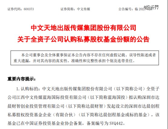 投资界-解码LP获悉,近日,中文传媒(SH:600373)发布公告,公司全资子公司江西中文传媒蓝海国际投资有限公司(简称:蓝海国投)拟认购深圳市达晨财智创业投资管理有限公司(简称:达晨财智)发起设立的深圳市达晨创程私募股权投资基金企业(有限合伙),基金已在中国证券投资基金业协会备案,达晨创程基金目前规模26.77 亿元,预计募集总规模50亿元,其中,蓝海国投作为有限合伙人拟以自有资金出资1.5亿元。基金管理人为达晨财智。