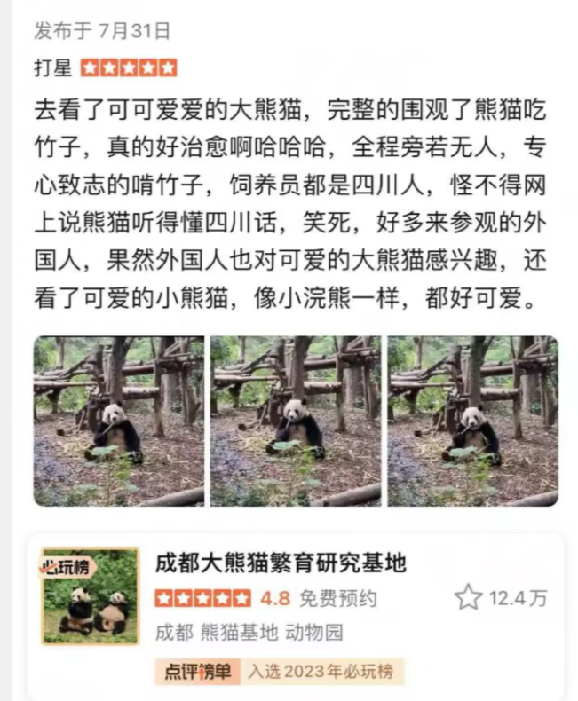 而来到了成都,一睹国宝熊猫的可爱真容更是既定行程。“大运会期间,好多来参观的外国人,果然外国人也对可爱的大熊猫感兴趣。”“这么呆萌的花花,国人都爱得不得了,何况外国友人。”从网友评价可以发现,“去大熊猫繁育研究基地看熊猫,扎堆买纪念品”也是外国运动员们的必选项。