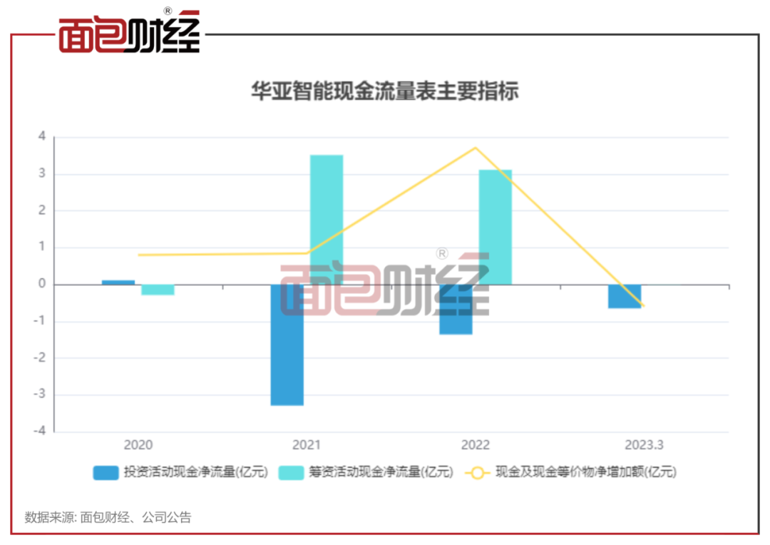 业绩下滑,加上没有融资,2023年一季度华亚智能现金及现金等价物净减少6023.69万元。分析发现,公司2021年、2022年的现金及现金等价物净增加0.84亿元、3.71亿元,其中筹资活动净现金流比重较大。