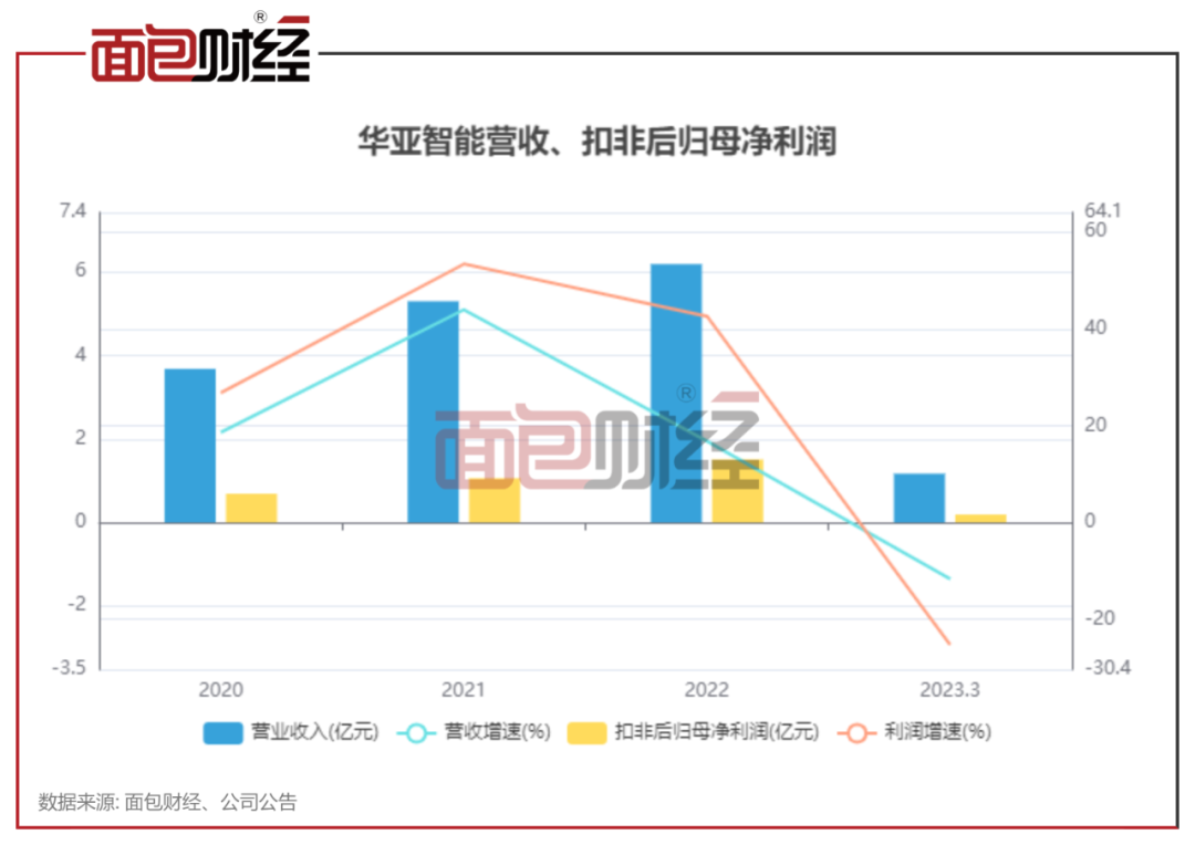 2020年至2022年,华亚智能的营收、扣非后归母净利润保持增长,但业绩增速自2022年出现下滑。2023年一季度,公司营收1.17亿元、扣非后归母净利润0.19亿元,分别同比下滑11.65%、25.3%。