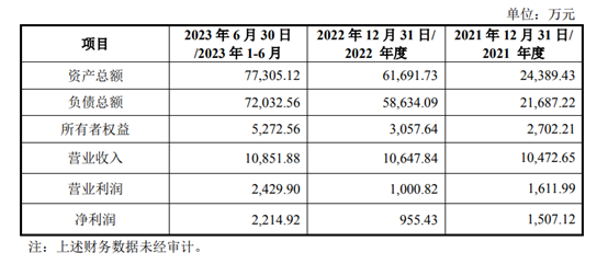 冠鸿智能主要从事生产物流智能化方案的设计与优化,以及相关智能装备系统的研发、制造、集成和销售。截至2023年6月末,冠鸿智能的总资产约7.73亿元,资产负债率超过93%,负债偏多。2023年上半年,该公司营收1.09亿元,净利润约2214.92万元。
