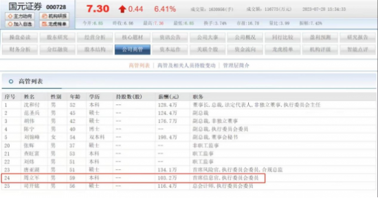 东方财富网资料显示,周立军在国元证券的年度薪酬为103.2万元。