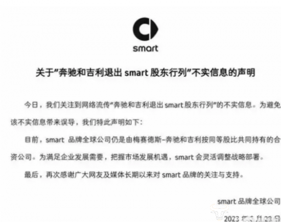 而且,今年还曾传奔驰和吉利退出smart股东行列,对此,smart品牌全球公司官方发布声明表示,“奔驰和吉利退出smart股东行列”为不实信息,目前,smart品牌全球公司仍是由梅赛德斯-奔驰和吉利按同等股比共同持有的合资公司。